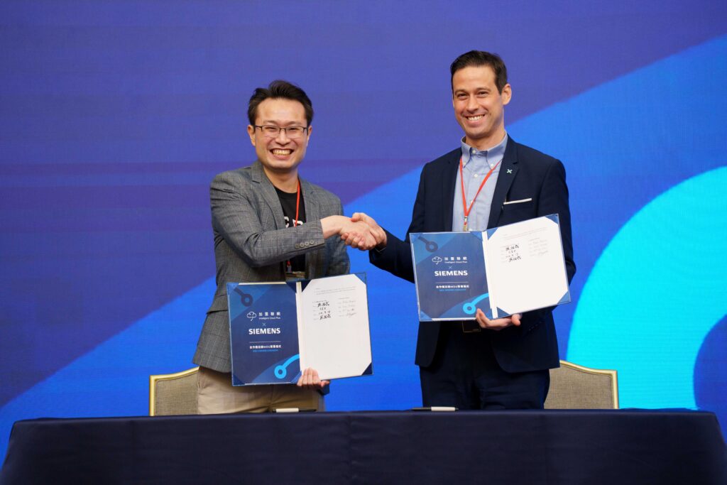 iVPP研討會。圖左起為加雲聯網總經理廖佑晟、西門子總經理 Fabian Bergeron,代表雙方於研討會現場簽署合作備忘錄,共同擘劃創新的虛擬電廠能源即服務平台VPP × EaaS。 圖 / 策略風知識新聞網