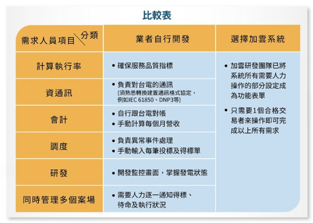 由於輔助服務市場仍然處於萌芽發展階段,如何以完整、專業、有即戰力的解決方案來避免在投資規劃上所耗損的時間及成本損失,或甚至錯失進入市場最好的時機,也是許多企業目前正面臨的難題;尤其以相對還不算非常成熟的交易機制來說,企業與電力交易平台間的資料傳輸、金額計算、核對和執行績效等都是參與市場的合格交易者需要審慎評估的項目。