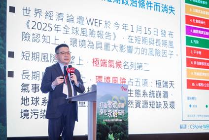 林修銘從資本市場的角度,闡述 ESG 議題在全球及台灣的重要性。他指出,即便面臨國際政治局勢的變化,永續發展仍是不可逆的趨勢。