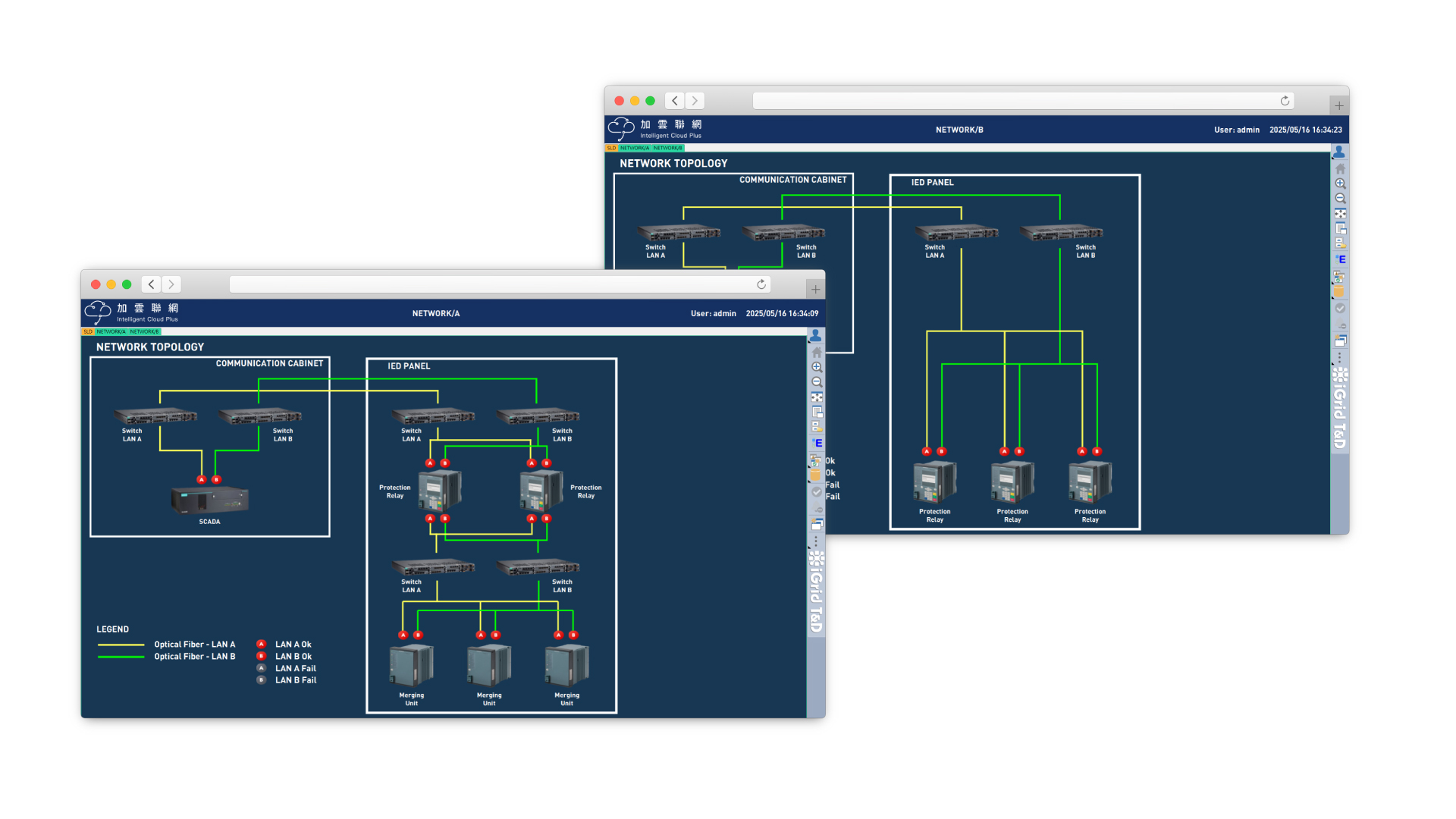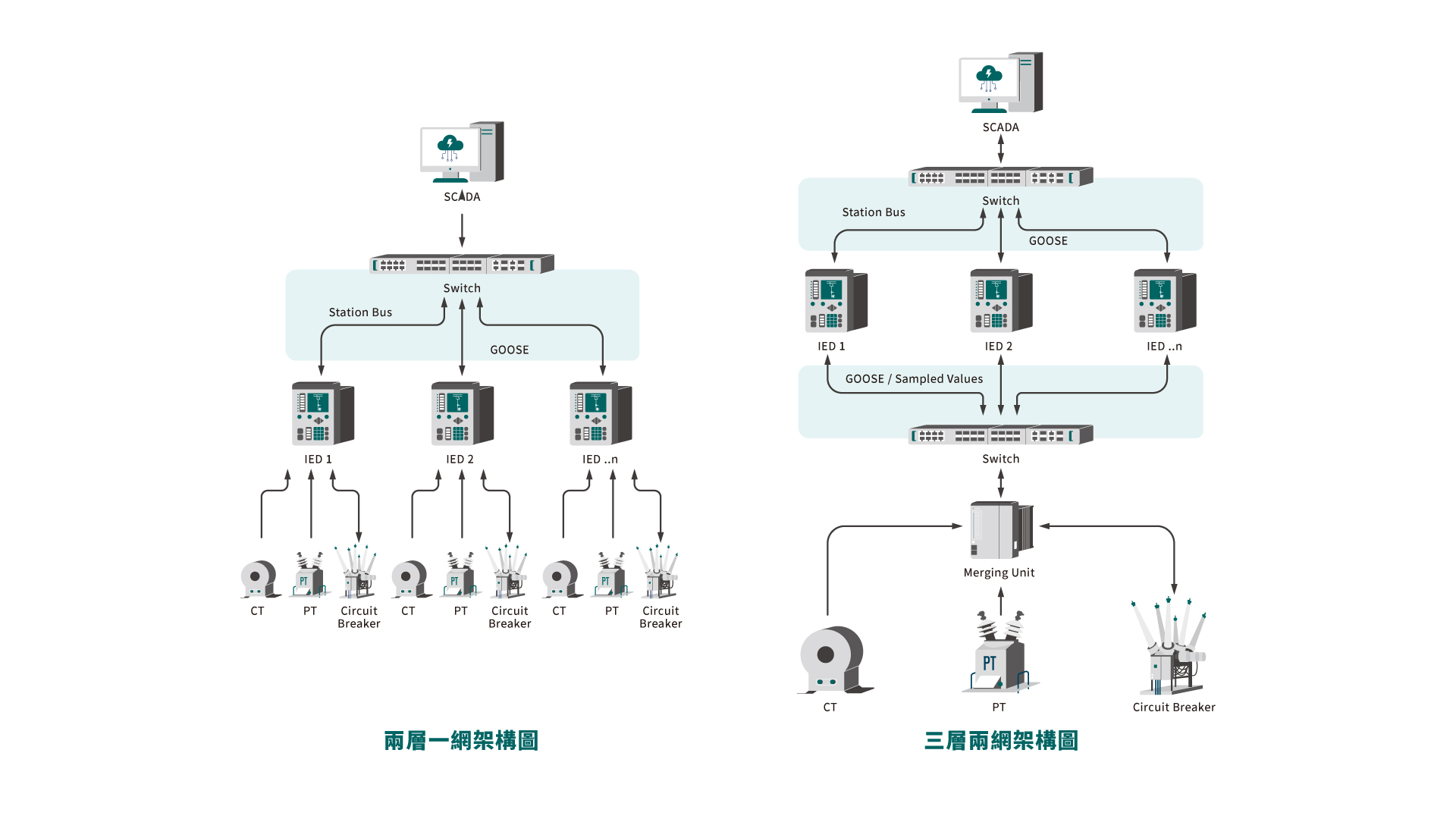 智慧電網可分為「兩層一網」與「三層兩網」,其主要差異在於網路層級的功能劃分與系統擴充彈性。「兩層一網」僅包含變電所層及間隔層,所有設備如IED、保護裝置與監控系統共用同一網段,結構簡單、建置快速,適合小型變電站。目前僅實作變電所層與間隔層的兩層一網架構,較未能充分體現IEC 61850標準藉由網路技術所強調的高維護性與彈性設計精神。