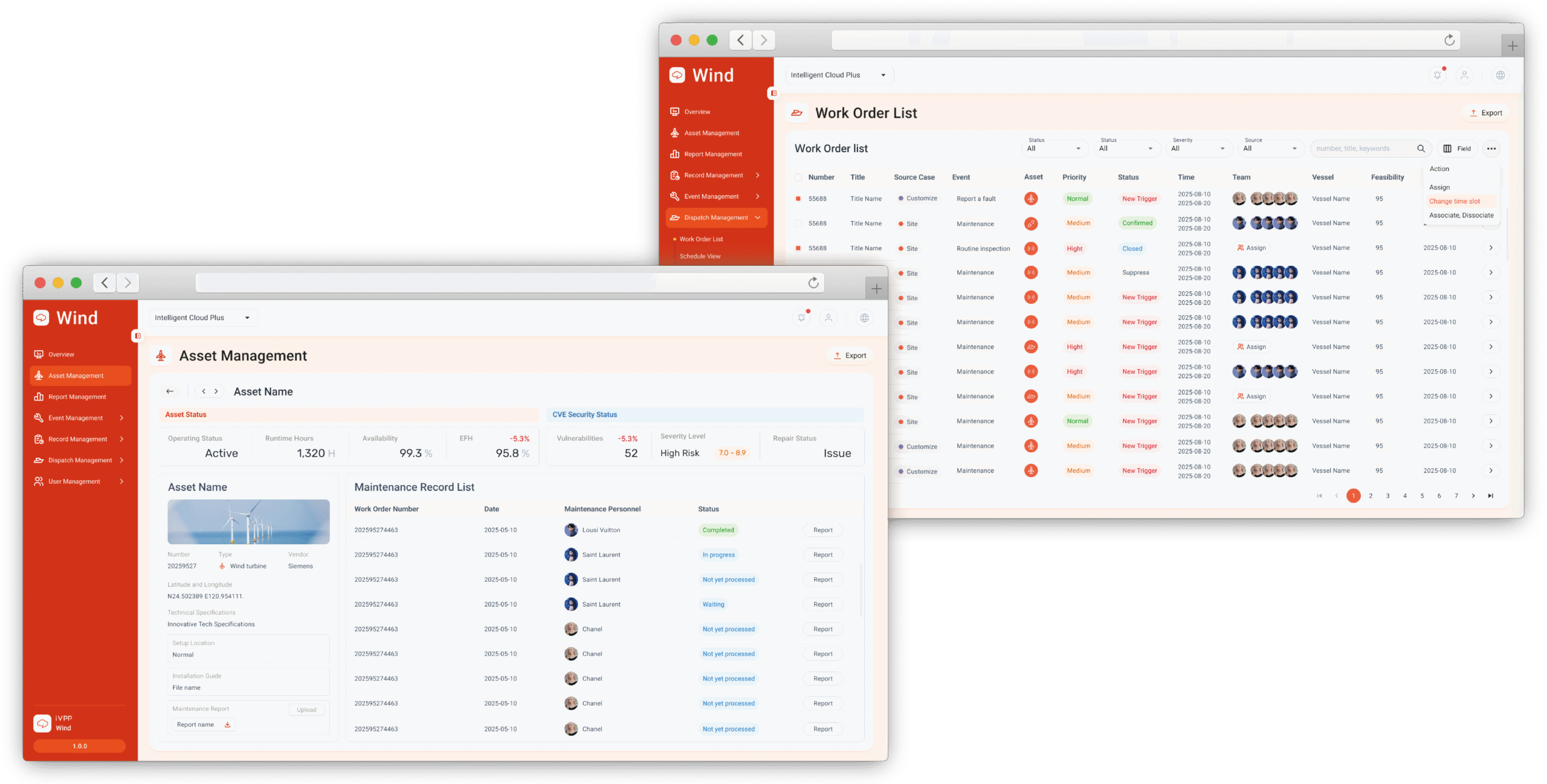 - Multi-Site Wind Farm Management:Enables unified management across multiple wind farms with cross-site monitoring of equipment, work orders, and performance to improve efficiency and resource flexibility.